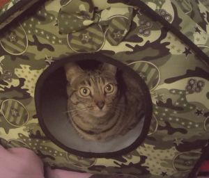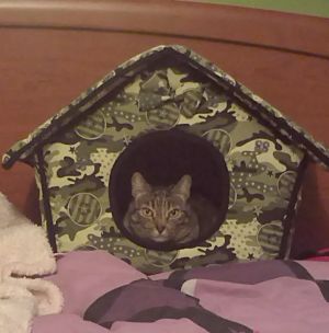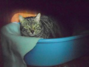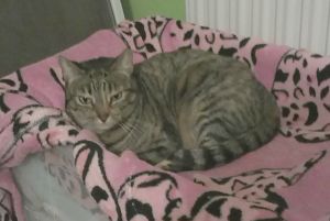 Ella está acogida en una casa en una habitación con su amigo George, se llevan muy bien y se quieren mucho, les encanta tumbarse juntitos.