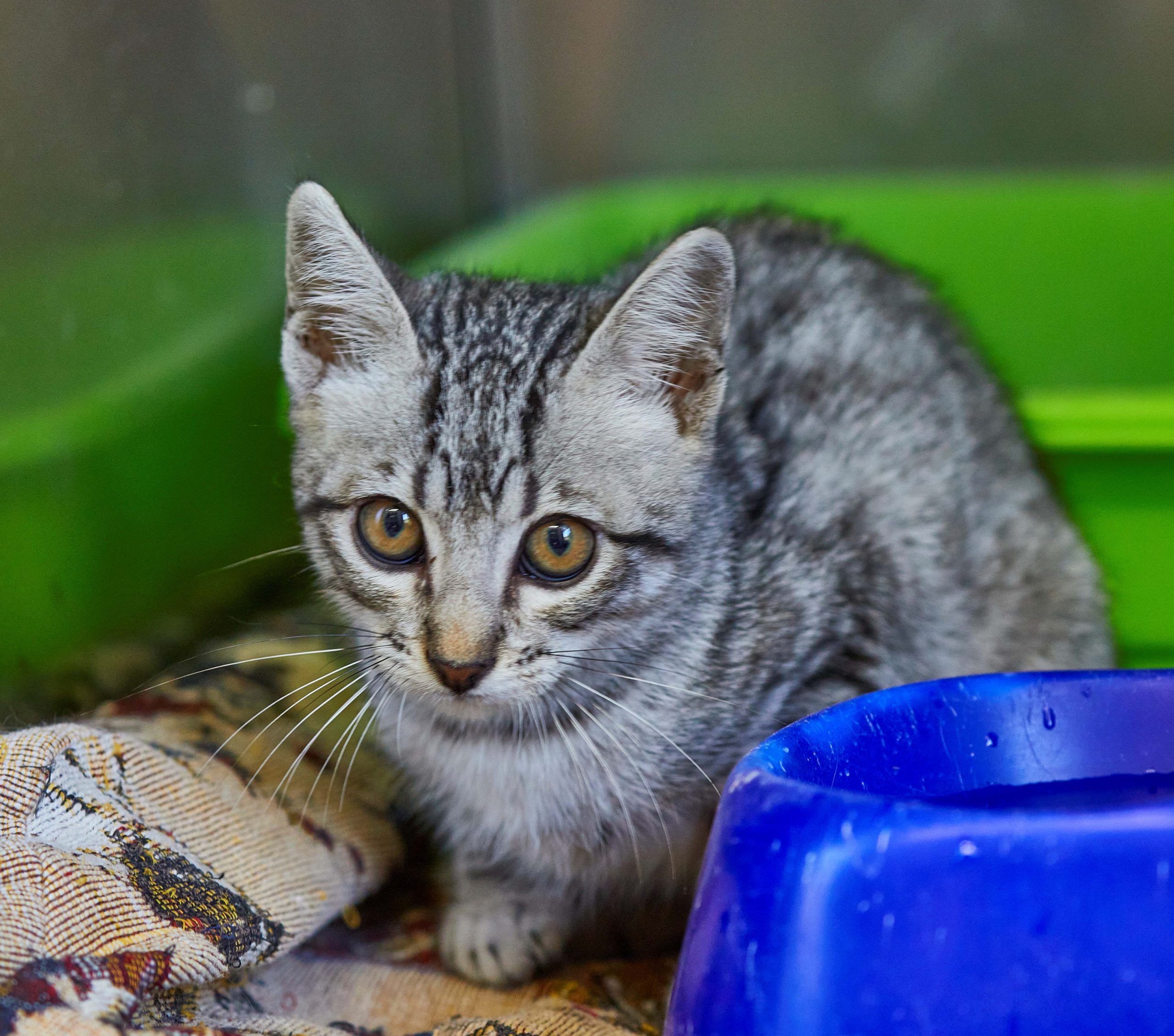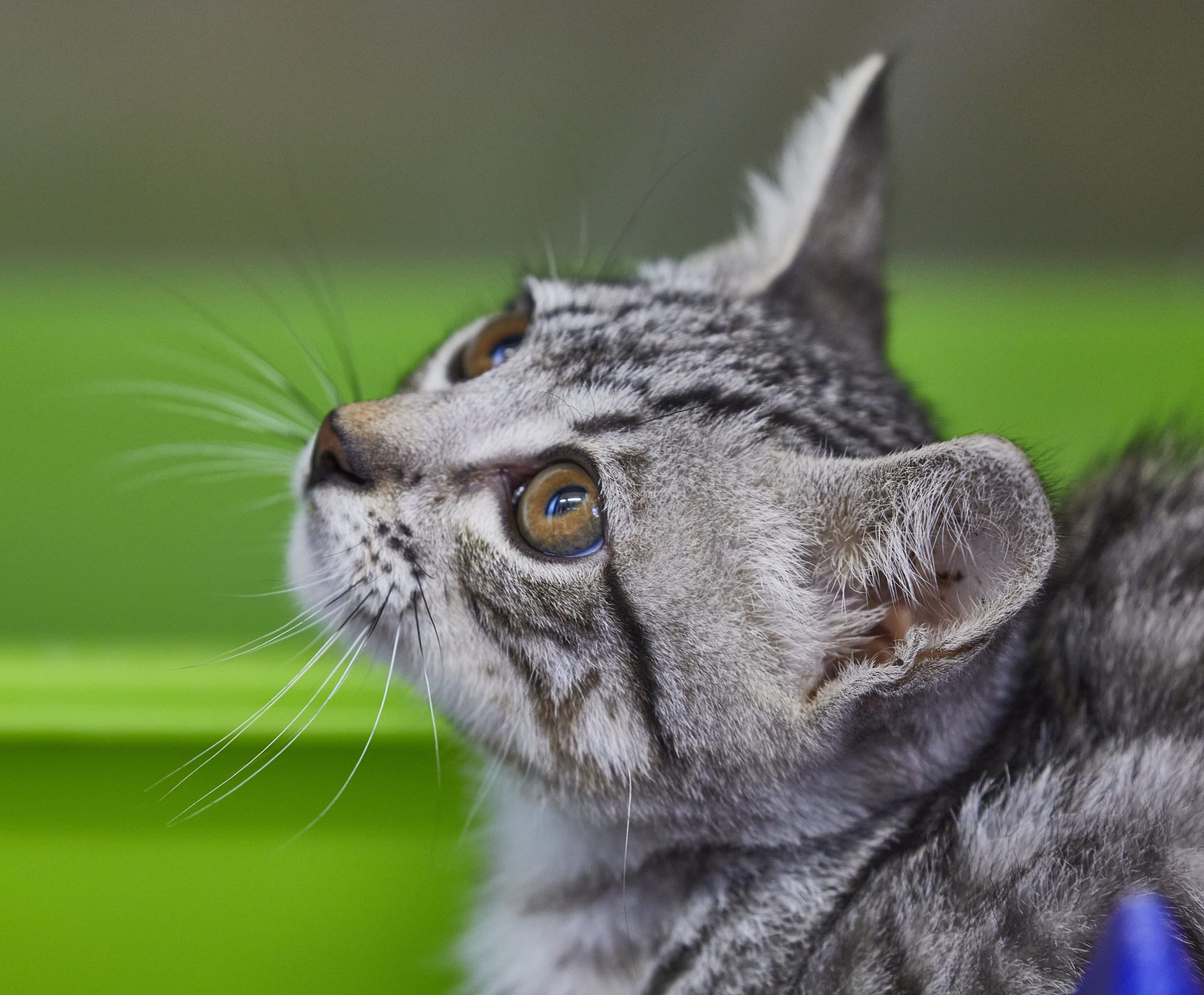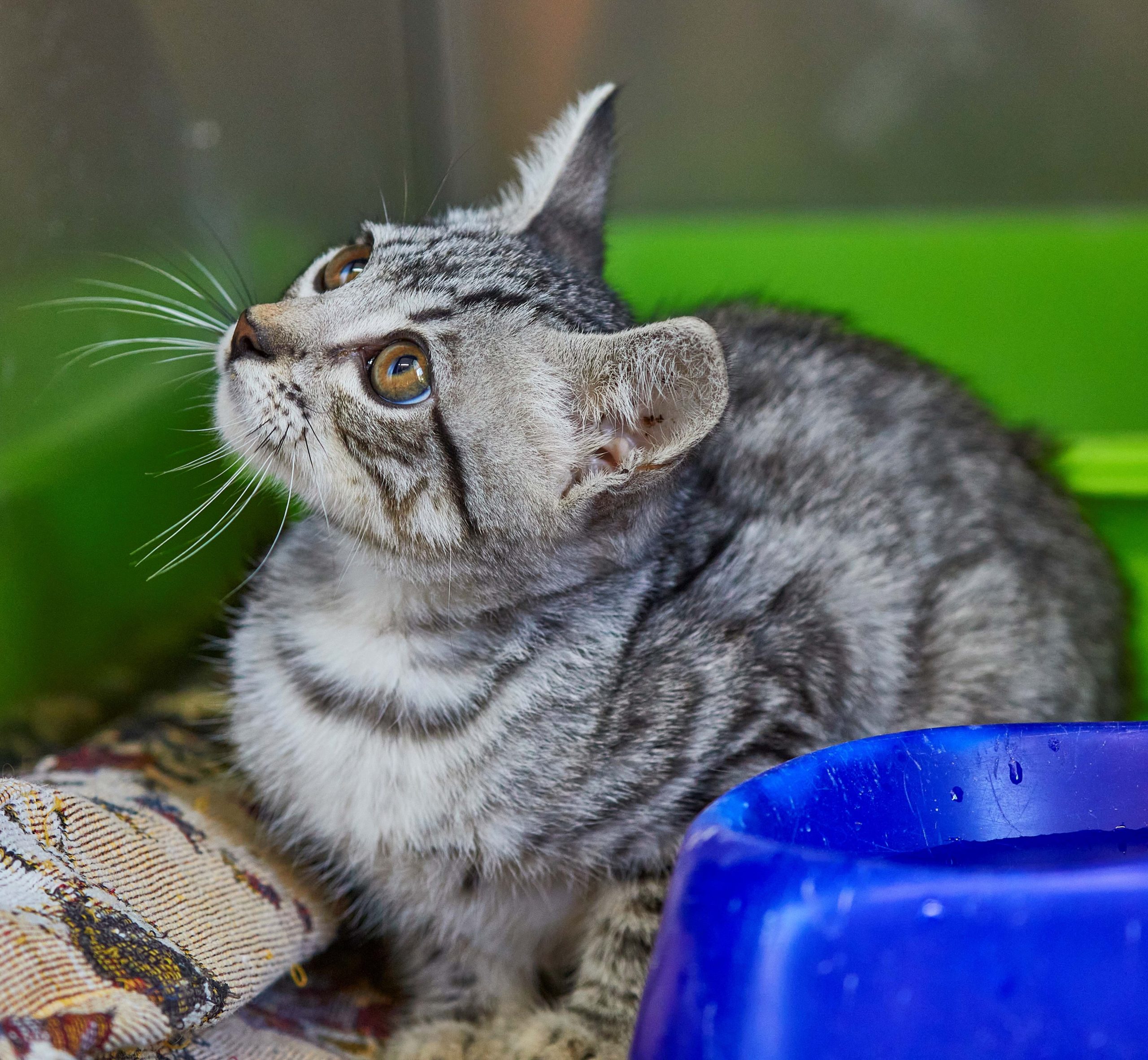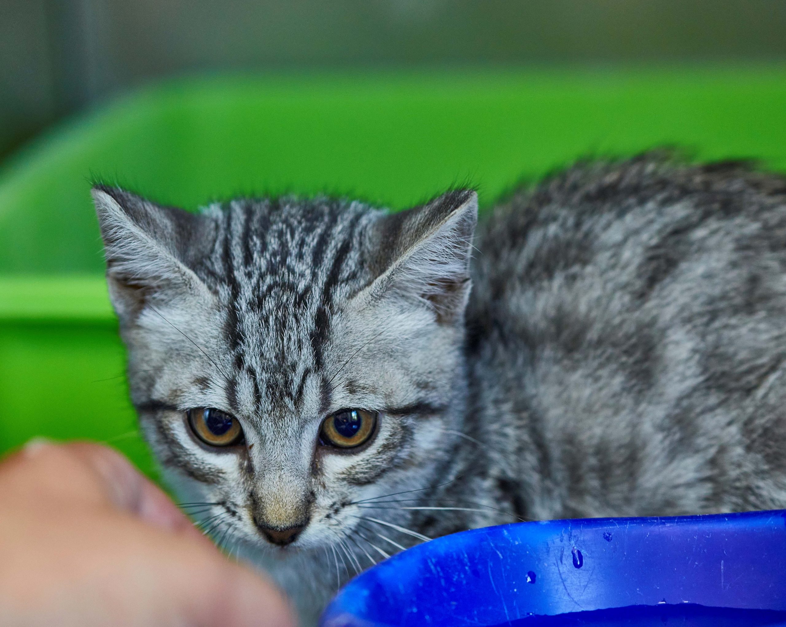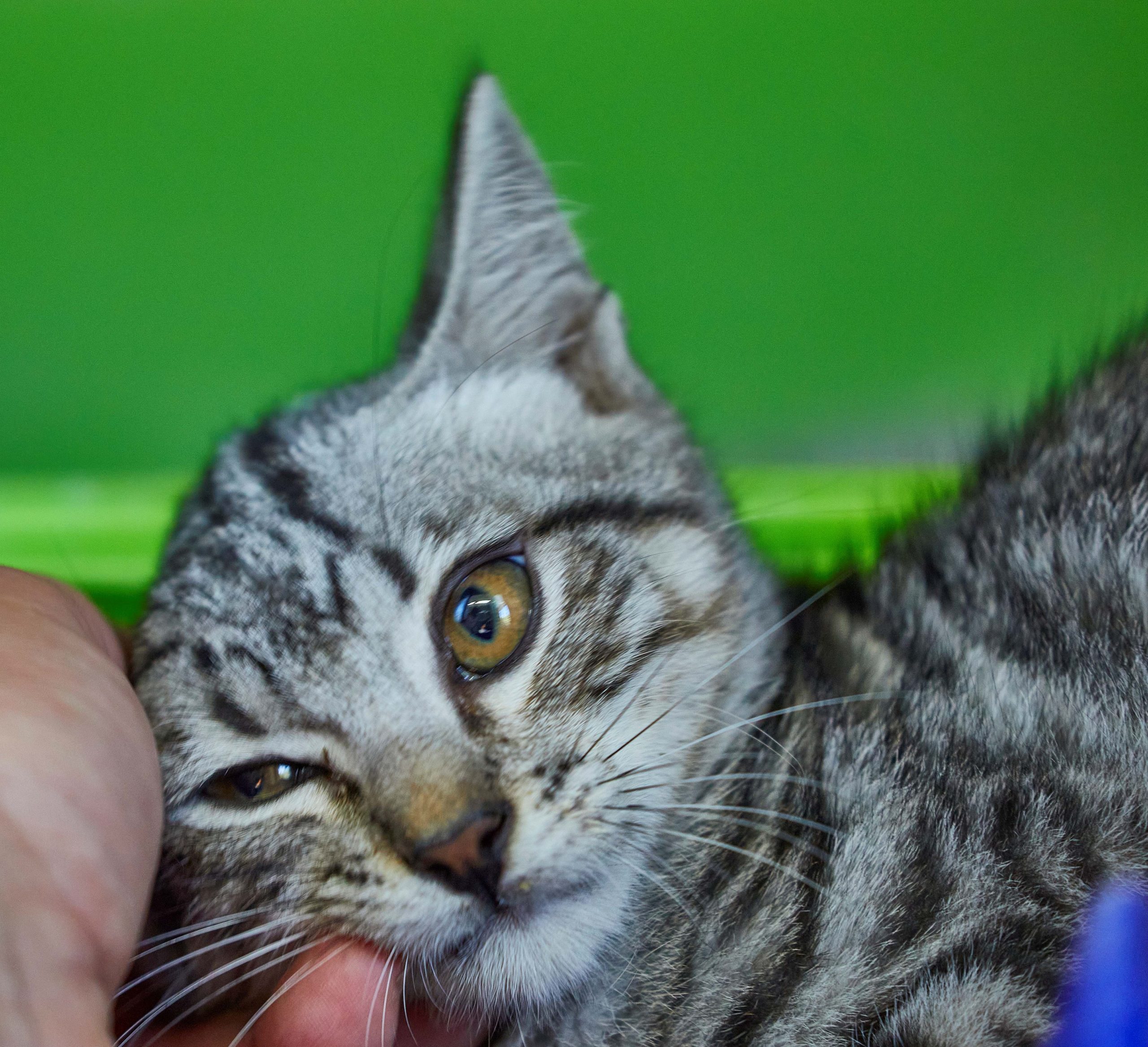 ZUKOV es un bebe, tiene tres mesecillos y fue recogido de la calle. Aún desconfía de las personas pero en cuanto le metes mano deja de bufar.  Es normal, ha pasado de vivir en la calle a que le miren y le toque seres humanos gigantes… Necesita tiempo y paciencia para confiar. Con otros gatos aun no sabemos porque no ha convivido en la misma jaula con otros.